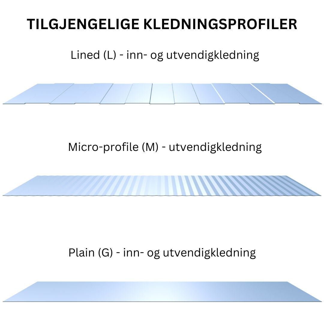 - Kledningstykkelse i mm: 0,4 / 0,5 / 0,6 / 0,7.
